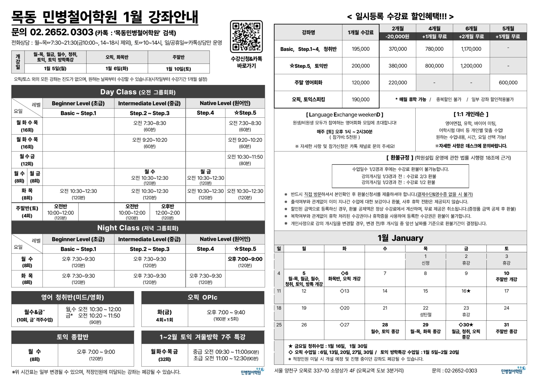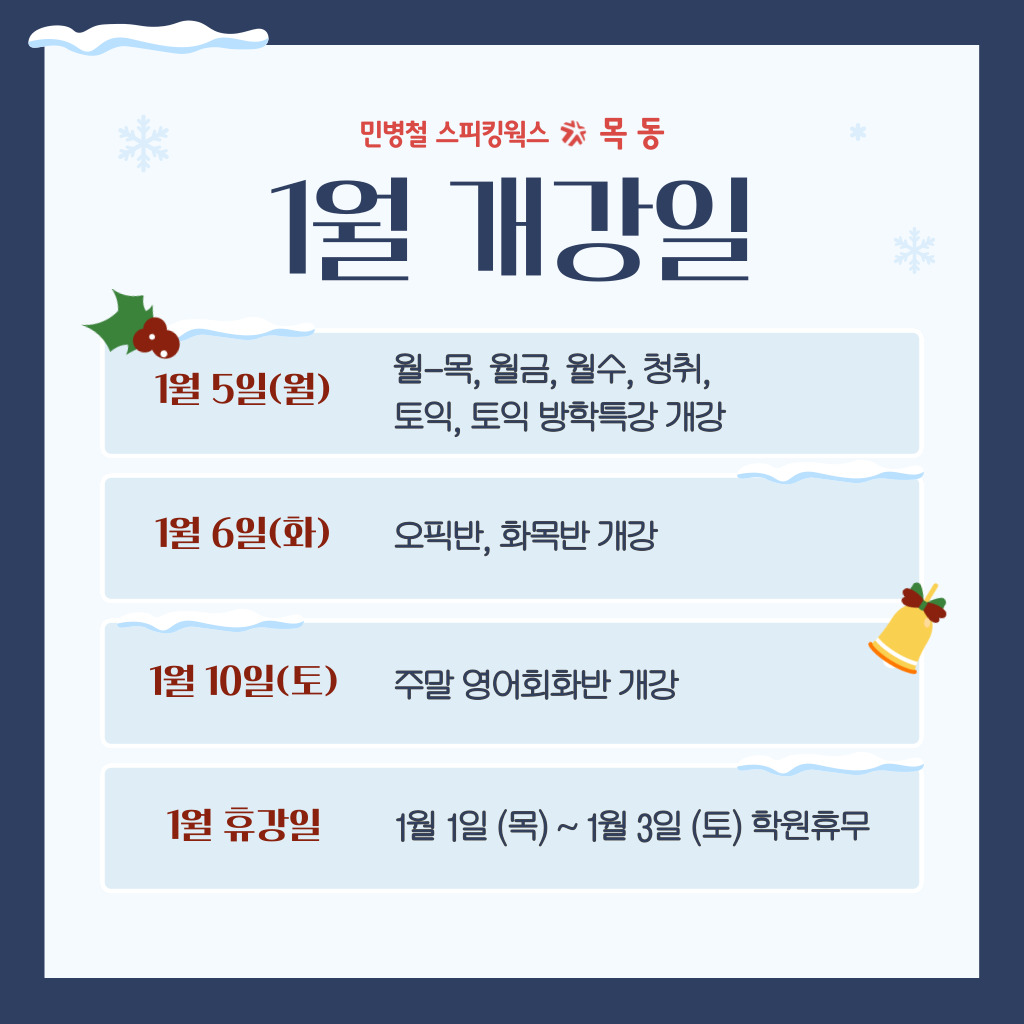 1월 5일(월) 월-목 / 월-금 / 월-수 / 토익 / 청취 / 오픽 / 토익 방학특강