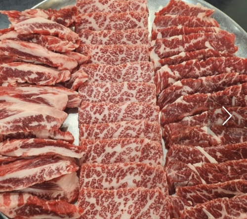 삼총사 (꽃갈빗살, 갈비살, 안창살) 180g 49,000 원 모듬 갈비살 35,000원 등심 38000원 한우 육사시미 34,000원 온 소면, 냉 소면 5,000원 된장 소면 5,000원