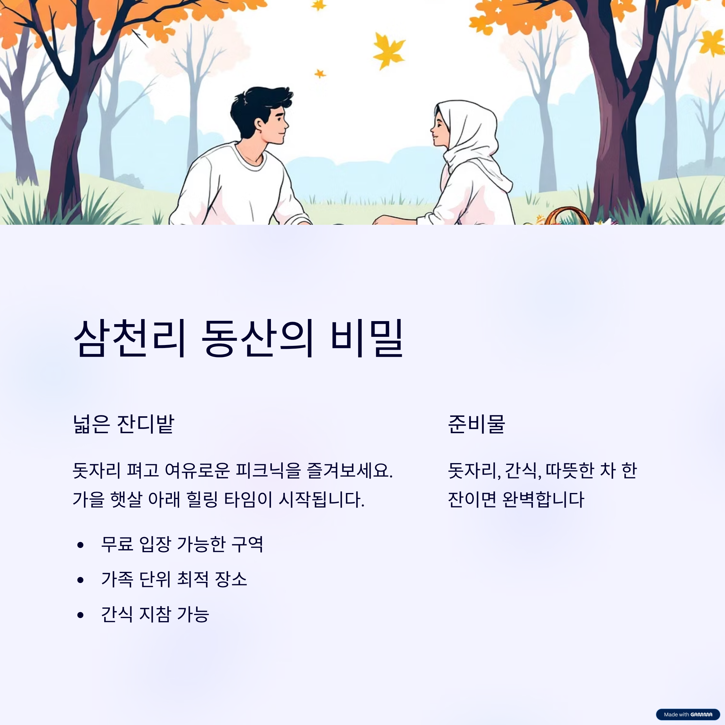 | 11:30 | 삼천리 동산 피크닉 | 따뜻한 커피와 함께 여유롭게 가을 소풍 즐기기 |